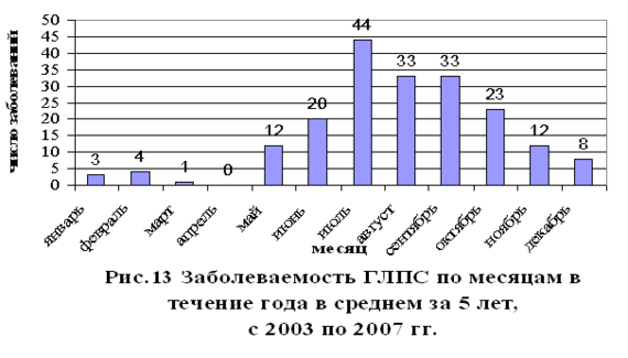 Наиболее благоприятными периодами года, являются зима и ранняя весна (особенно март и апрель), когда регистрируются единичные случаи. Рост заболеваемости начинается с мая, наибольшее количество случаев регистрируется в июле-октябре, в сезон сбора урожая, снижаясь с ноября. Это связано с активизацией инфекции в очагах (проявление восприимчивых молодых зверьков). Также с тем, что в летние и осенние месяцы люди чаще бывают в лесу, кроме того, осенью неблагоприятные погодные условия вызывают массовую миграцию РП за пределы лесных стаций в полевые угодья и поселения человека, сосредоточение животных на ограниченных участках. (Рис. 13)