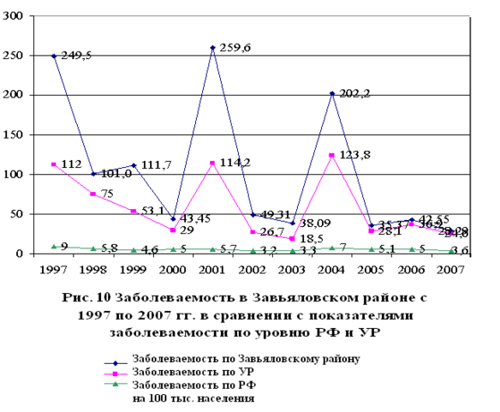Завьяловский район по показателю заболеваемости ГЛПС в период с 1997 по 2007 гг. замыкает десятку районов с наиболее высокими показателями, пропуская Увинский, М.Пургинский, Шарканский Селтинский, Алнашский, Як.Бодьинский, Кизнерский, Вавожский, Сюмсинский районы. В целом за 10 лет динамика заболеваемости показана на рис.10