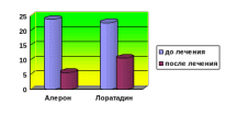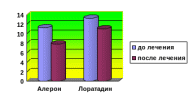 Также было оценено уменьшение суммарного балла симптомов ХК на 50%. Под влиянием Алерона это происходит в среднем на 6-7-й день(6,41± 0,13), лоратадина – на 11-12-й день (11,32±0,46).