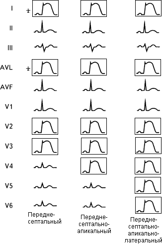 Данные электрокардиограммы, показывающие локализацию инфаркта: передняя стенка