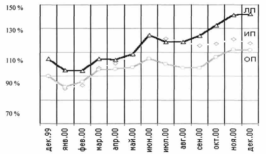 Як видно з діаграми, збільшення обсягів продажу продукції вітчизняного виробництва в групах А, С, D, J, L, М, R, V супроводжувалося зменшенням обсягів реалізації лік закордонного виробництва. В інших групах показники темпів приросту мали одноіменний знак. Протягом 2000 року спостерігалось поступове зростання роздрібних цін на лікарські препарати (на тлі підвищення цін на продукти харчування, товари народного споживання). Збільшення середньої ціни на препарати склало 26% у порівняльних цінах грудня 1999 року (Рис. 6). При цьому внутрішня структура ціни змінювалася нерівномірно. Препарати закордонного виробництва подорожчали на 14%, а лікарські засоби вітчизняних виробників на \\%.[д4]