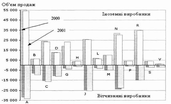Рис. 1.5 Структура споживання лікарських препаратів вітчизняних і іноземних виробників на роздрібному сегменті фармацевтичного ринку по фармакотерапевтическим групах АТС у 2000 і 2001 роках