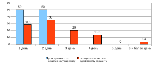 Процентное соотношение пациентов с адаптивным и дезадаптивным вариантом восприятия своей болезни с падением температуры до нормы по дням показан на рис. 3.