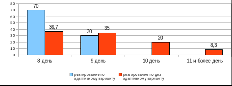 Дни выписки из стационара у представителей типов восприятия болезни различны. Так при адаптивном варианте: представители гармонического типа на восьмой день выписано 66,7 %, на девятый — 33,3 %; эргопатический тип: восьмой день — 77,8 %, девятый день — 22,2 %; анозогнозический: восьмой день — 66,7 %, девятый день — 33,3 %.