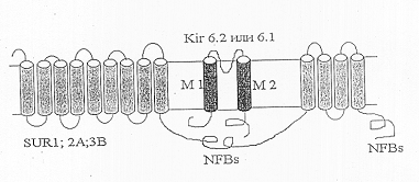 Также был клоирован регуляторный белок, содержащий участок, связывающий сульфонилочевину (SU-связывающий сайт) [Aguillar-Bryan et al., 1995; Thomas et al., 1995; Inagaki et al., 1996; Isomoto et al., 1996]. Клонированные регуляторные белки получили название SUR. SUR содержит два нуклеотидсвязывающих участка (NFBs) с цитоплазматической стороны. N-конец находится с внешней стороны мембраны и содержит два домена, предположительно из 9 и 4 пронизывающих мембрану спиралей (Рис.2) [Yokoshiki et al., 1998].