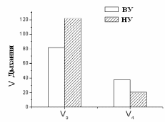 НУ – низкоустойчивые к гипоксии животные, ВУ – крысы, высокоустойчивые к гипоксии. Концентрация белка в кювете – 1-2 мг/мл. Среда инкубации: 5 мМ Tris-HCl, 200 мМ сахарозы, 50 мМ KCl, 5 мМ NaH2PO4, 3 мкМ ротенона, рН 7.2. Эксперименты проводились в закрытой ячейке при постоянном перемешивании и термостатировании при температуре 26°С.