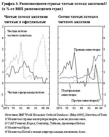 Рух капіталу: рис. 2.2 служить ілюстрацією явища, яке нерідко асоціюється з процесом глобалізації, - різкого зростання припливу приватних капіталів у країни, що розвиваються, протягом більшої частини 90-х років ХХ століття. З графіка видно також, що а) цей ріст відбувся після періоду особливо вираженого “пересихання” цих потоків у 80-і роки, що б) чисті припливи офіційної “допомоги” чи допомоги з метою розвитку помітно скоротилися з початку 80-х років і що в) структура приватних потоків зазнала радикальних змін. Найбільш важливою категорією стали прямі іноземні інвестиції. Портфельні інвестиції і банківські кредити також збільшилися, однак вони характеризувалися більшою нестійкістю й особливо різко скоротилися слідом за фінансовими кризами наприкінці 90- х років.