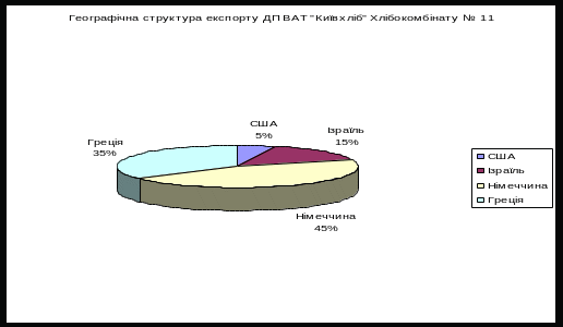Як видно із рисунка 2.3. найбільшим імпортером продукції ДП ВАТ "Київхліб" Хлібокомбінату №11 є Німеччина (45 %), далі за величиною обсягів імпорту ідуть Греція (35 %), Ізраїль (15 %) та США (5 %).