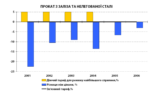 Рисунок 2.9 - Прокат з заліза та нелегованої сталі. Порівняння цін та тарифів, 2001–2006 рр. [17]