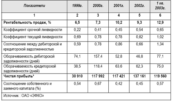 В таблице представлены основные показатели деятельности ОАО «ЭФКО» за 1999, 2000, 2001, 2002 г.г. и 1 кв. 2003г.