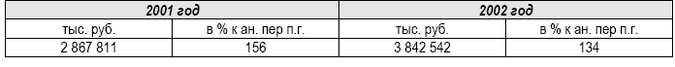 Объем продаж в 2002 г. (стр. 10 по ф.2) составил 3 842 542 тыс. руб. и увеличился по сравнению с аналогичным периодом прошлого года на 134%. В таблице приведены показатели динамики объема выручки за 2001-2002 г.г.