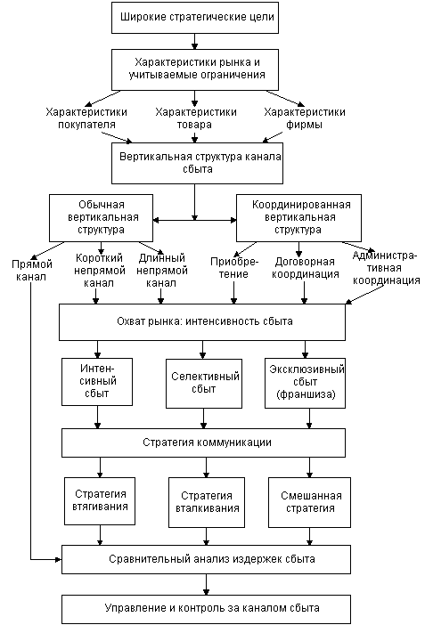 Выбор структуры канала сбыта сводится к решению вопроса о распределении обязанностей между участниками процесса обмена. С точки зрения фирмы, прежде всего нужно решить, следует ли поручать кому-либо часть функций сбыта, и если да, то в каких пределах и на каких условиях.