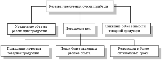 Резервы увеличения суммы прибыли определяются по каждому виду товарной продукции. Основными их источниками является увеличение объема реализации продукции, снижение ее себестоимости, повышение качества товарной продукции, реализация ее на более выгодных рынках сбыта и т.д. (рис. 6)