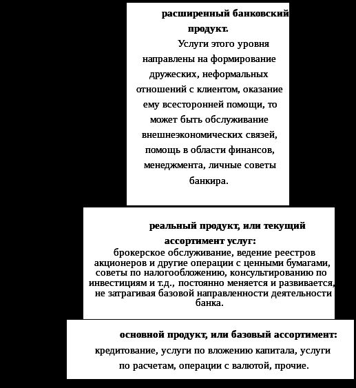 Исходя из этих особенностей, банковский продукт можно разделить на три уровня: основной продукт (услуга); реальный продукт; расширенный продукт.