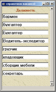 Данный справочник помогает менеджеру кадрового агентства увидеть все вакансии и определить, есть ли в наличии та или иная вакансия. Информация в справочнике обновляется автоматически при занесении новой вакансии.