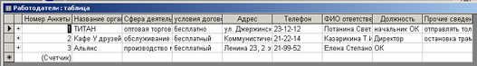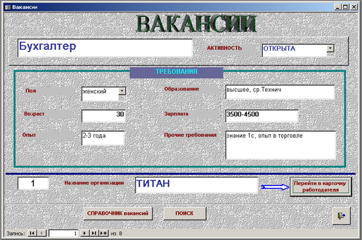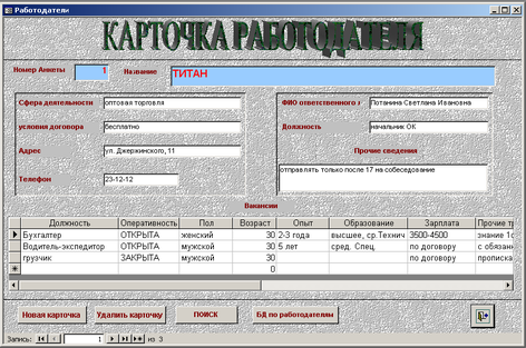 При выборе первого пункта меню «Карточка» открывается форма карточки работодателя. В ней находится вся необходимая информация о предприятии, которое подало заявку на работников. Карточка открывается на первой записи таблицы (начинается с первого номера). В данной форме находится подчиненная форма «Вакансии», в которой указываются все вакансии и их требования (рис. 11).