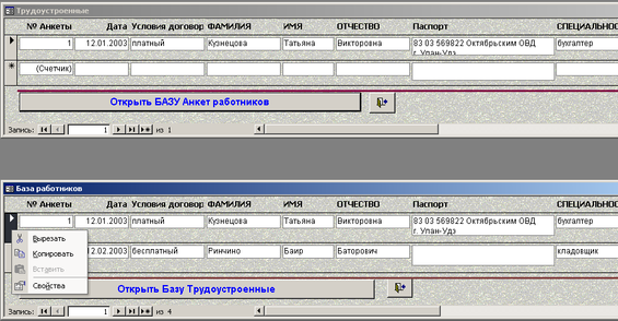 При выборе третьего пункта главного меню «Трудоустроенные» – открывается база трудоустроенных работников, выполненных обязательств кадрового агентства. База хранит все данные работников, которые заключали договора и были устроены по направлениям. Предусмотрена кнопка «Открыть базу анкет работников», которая предназначена для осуществления процедуры копирования. Копирование анкеты в базу «Трудоустроенные» осуществляется через базу «Работники» с помощью контекстного меню, которое вызывается нажатием правой кнопки мышки. Структура базы «Трудоустроенные» аналогична структуре базы «Работники». Если же необходимо восстановить анкету в основной базе, то процедура копирования делается в обратную сторону (рис. 9).