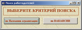 Если менеджеру нужно заполнить новую карточку или удалить старую, то в анкете предусмотрены две кнопки «Новая карточка» и «Удалить карточку». Также в анкете предусмотрен поиск необходимой информации по всем работодателям. При нажатии на кнопку «Поиск» появляется форма выбора критерия поиска. Для работодателей поиск может осуществляться по двум параметрам: по названию организации, по вакансии (рис. 12).