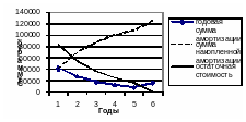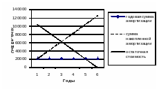 На основе вышеизложенного материала представим графически условную динамику остаточной стоимости внеоборотных активов, суммы годовой и накопленной амортизации (рис.1.3, 1.4, 1.5).
