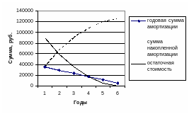 При использовании коэффициента ускорения достигается более высокая степень амортизируемости основных средств [10,с.70]. В этом случае, как правило, сумма амортизационных отчислений по последнему году не рассчитывается, а списывается вся остаточная стоимость. Если определена ликвидационная стоимость, то сумма амортизации последнего года ограничивается размером, необходимым для уменьшения остаточной стоимости объекта до ликвидационной. Поскольку при данном способе в первые годы списывается большая часть стоимости объекта основных средств (в первые три года переносятся затраты более 70% их стоимости), то данный способ относится к способам ускоренной амортизации.