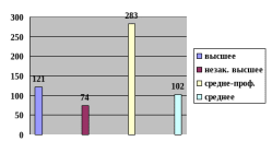 Из таблицы 2.4. видно, что самое большее количество работников имеют среднее – профессиональное образование 283 человека, дальше идут работники с высшим образованием – 121 человек, 102 человека – среднее образование и только 74 человека заканчивают высшее образование.