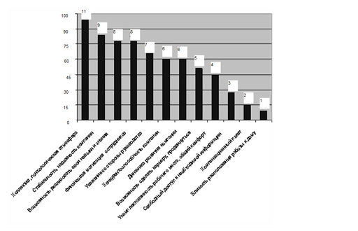 Кроме этого, было выявлено, что 80% работников организации в ближайшее время не собираются покинуть её. Однако если бы пришлось менять работу, то 80% опрошенных ушли бы из данной организации по причине низкой зарплаты. Однако не только фактор высокой заработной платы определяет выбор места работы. Вторым и третьим по значимости фактором были названы «возможность долговременных отношений с работодателем» (40%) и «возможность получения социальных благ» (40%).