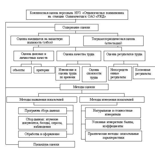 Оценка результатов труда – одна из функций по управлению персоналом в НУЗ «Отделенческая поликлиника на станции Сольвычегодск ОАО «РЖД», направленная на определение уровня эффективности выполнения работ. Она является составной частью деловой оценки управленческого персонала наряду с оценкой его профессионального поведения и личностных качеств и состоит в определении соответствия результатов труда работника поставленным целям и запланированным показателям.