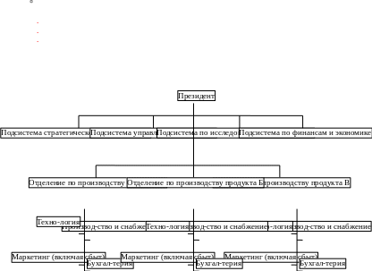 Основу линейно-функциональной структуры составляет «шахтный» принцип построения и специализация управленческого персонала по функ-циональным подсистемам организации (маркетинг, производство, исследо-вания и разработки, финансы, персонал и т. д.). По каждой подсистеме фор-мируется иерархия служб («шахта»), пронизывающая всю организацию сверху донизу (рис. 1).