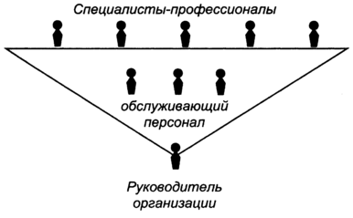 Одной из последних разработок, развивающих идею гибких органичес-ких структур управления [37], является их построение в форме перевернутой пирамиды, в которой на верхний уровень иерархии выведены специалисты-профессионалы, в то время как руководитель организации находится в ниж-ней части схемы. Такие структуры могут использоваться там, где профессио-налы имеют опыт и знания, дающие им возможность действовать независимо и квалифицированно удовлетворять потребности клиентов. Прежде всего, это относится к организациям здравоохранения и образования, где сконцентри-ровано большое число специалистов, работающих самостоятельно при под-держке вспомогательного или обслуживающего персонала (рис. 9).