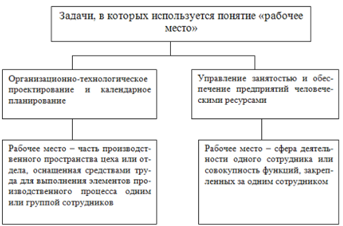 В организационно-техническом и эргономическом аспектах рабочее место - это часть производственного пространства цеха или отдела, оснащенная средствами труда (оборудованием, инструментами, приспособлениями) для выполнения относительно обособленной части производственного процесса одним или группой сотрудников. Такое определение предполагает рационализацию выбора и размещения технических средств, обеспечивающих безопасную и эффективную деятельность людей в соответствующей части подразделения предприятия [40. C. 116].