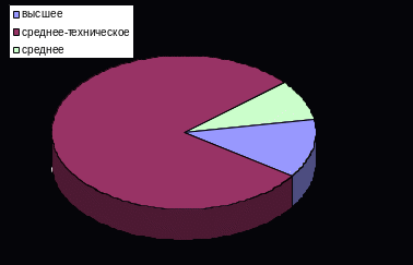 Из диаграммы видно, что состав персонала данной организации состоит в основном из образованных людей, имеющих средне-техническое образование. Руководящий состав, конечно, состоит из образованного персонала, имеющего высшее образование каждый в своей отрасли.