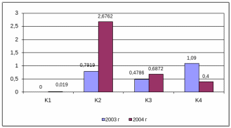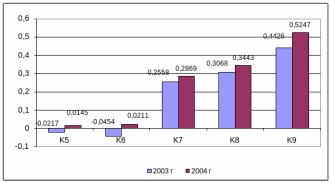 Коэффициент валовой прибыли (К7) показывает отношение значения валовой прибыли к чистой прибыли от реализации. Повышение этого показателя свидетельствует о возрастании эффективности деятельности общества. В 2003 году наметилось возрастание коэффициента рентабельности реализации (К8) и рентабельности затрат (К9).