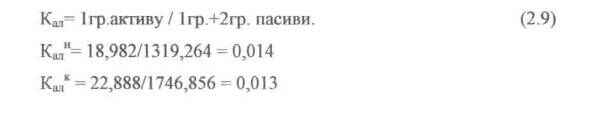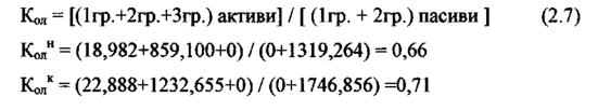 Ккл = 1 гр. активу балансу / (1 гр. + 2 гр. + 3 гр.) активи балансу. (2.14)