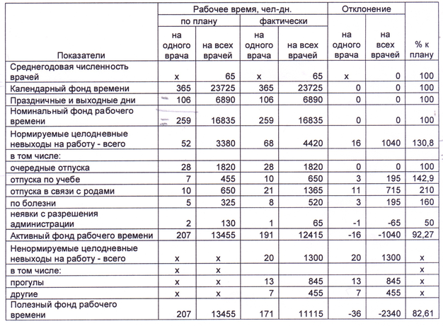 Данные таблицы 5 позволяют сделать вывод, что в Копыльской ЦРБ фактический уровень использования рабочего времени ниже планового. План по количеству явок на работу выполнен только на 92,27%, а по численности работников - на 100%. Следовательно, рабочее время недоиспользуется на 7,73%. Причинами такого положения является увеличение количества неявок на работу по болезни на 3 дня. Кроме того, имелись случаи нарушения трудовой дисциплины. По этой и другим причинам фонд рабочего времени недоиспользован на 17,39%