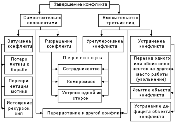 Основными формами завершения конфликта являются: разрешение, урегулирование, затухание, устранение, перерастание в другой конфликт.