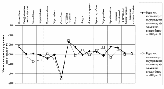 порівняльний аналіз відносних часток витрат на утримання персоналу в АКБ “Приватбанк" та в найбільших банках України у 2005 - 2006 роках;
