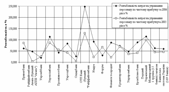 якщо у 2005 році тільки в 3 із 15 банків першої групи рейтингу банків України рівень рентабельності витрат на утримання персоналу по чистому прибутку був більший ніж в АКБ “Приватбанк" (рис.2.6), то у 2006 році вже в 8 із 15 банків першої групи рейтингу банків України рівень рентабельності витрат на утримання персоналу по чистому прибутку був більший ніж в АКБ “Приват-банк”, при цьому у 2006 році рівень рентабельності в АКБ “Приватбанк" практично знизився до середнього показника по банківській системі Україні.