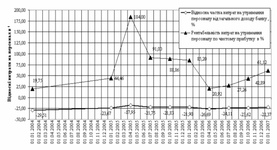 на протязі 2006 року регулювання відносної частки витрат на утримання персоналу від загального доходу банку (рис.2.5) відбувалось з рівня 26,7% (1 квартал 2006 року) до рівня 22,37% на кінець 2006 року, що дозволило врегулювати рівень рентабельності витрат на утримання персоналу (витрати) по чистому прибутку банку (результат) до рівня 61,1% на кінець 2005 року;