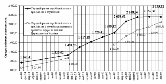 Рис. 2.8 Динаміка росту середньомісячного рівня заробітної плати працівнику АКБ “Приватбанк" в порівнянні з ростом середньостатистичного рівня заробітної плати в фінансовій сфері України у 2003 -2006 роках