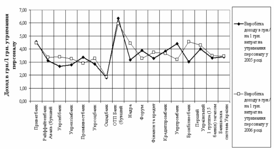 порівняльний аналіз рівней виробітку доходу банка на 1 грн. витрат на утримання персоналу в АКБ “Приватбанк" та в найбільших банках України у 2005 - 2006 роках;