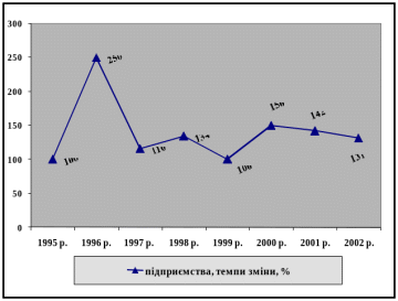 У 2002 році (порівняно з 2001 р.) кількість малих підприємств збільшилась у 10 разів, а кількість фермерських господарств – майже в 17 разів, однак кількість діючих кооперативів постійно зменшувалася. Разом з тим, вже в 1994-1995 рр. Проявляються негативні тенденції у процесі становлення та розвитку малого підприємництва [30]. Про це свідчить динаміка зміни кількості суб’єктів підприємництва (рис. 2.1).