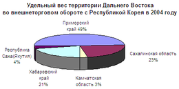 Внешнеторговый оборот Сахалинской области с Республикой Корея в 2004г. составлял 216,6 млн. долл., что на 75% выше 2003 года, при этом экспорт 2004г. – 146,4 млн. долл. увеличился на 26 %, а импорт – 70,2 млн. долл., увеличился на 48 %. Наибольший объем экспорта в Республику Корея составили суда и плавучие конструкции – 41%. Стоимость импорта Сахалинской области увеличилась по сравнению с 2003 годом за счет машин, оборудования и механизмов, их частей – на 14,5 млн. долл., изделий из черных металлов – на 12,6 млн. долл. Наибольший удельный вес в стоимости импорта области из Республики Корея составили: машины, оборудование и механизмы – 34%, изделия из черных металлов – 33%.