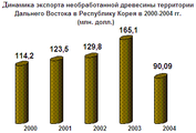 Рисунок 3.3 – Динамика экспорта необработанной древесины Дальнего Востока в Республику Корея в 2000-2004 гг., млн. долл. США