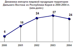 Пищевая продукция. В 2004 году Дальний Восток импортировал из Республики Корея пищевой продукции на сумму 23,66 млн. долл., что на 15% ниже уровня прошлого года (рисунок 4.2).