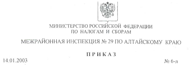 В соответствии с приказами Министерства Российской Федерации по налогам и сборам от 24.10.2002 № БГ-3-15/600 «О структуре Управления МНС России по Алтайскому краю», от 15.08.2002 № БГ-3-15/438 «О предельной численности территориальных органов МНС России», от 05.04.2002 № БГ-3-30/179 «О создании межрайонных инспекций по крупнейшим налогоплательщикам», приказом Управления МНС России по Алтайскому краю от 13.11.2002 № 315 «О реорганизации Межрайонной инспекции МНС России № 29 по Алтайскому краю»