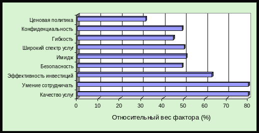 По данным исследования самыми весомыми характеристиками для клиентов всех банковских учреждений, в которых проводилось исследование, являются: компетентность персонала, быстрое обслуживание, надежность банковского учреждения, широкий выбор услуг, хранение банковской тайны.