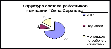 Из рисунка видно, что основную массу работающих составляют ИТР (инженерно-технические работники)-22 человека, 3 человек – водителей,5- менеджеров по работе с клиентами.