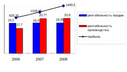 Рентабельность производства возросла к 2008 году на 17%, в то время, как рентабельность продаж выросла всего на 0,8% за три года и составила 19,45% в 2008 году. Рентабельность продаж показывает, сколько прибыли предприятие получило с каждого рубля реализованной продукции. Такая незначительная динамика рентабельности продаж может быть связана с незначительным размером реализации по сравнению с себестоимостью реализованной продукции, высокая доля которой в выручке предприятия связана с ростом затрат на производство продукции. Небольшой рост рентабельности продаж обусловлен снижением затрат на реализацию продукции. Дальнейший рост рентабельности продаж можно обеспечить либо дальнейшим расширением объемов реализации вкупе с поиском новых, более экономичных методов и способов сбыта продукции, либо за счет оптимизации затрат на производство продукции.