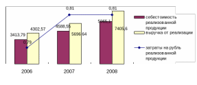 В то же время рост себестоимости товарной продукции, в которую входят затраты на сырье и материалы, заработная плата работников, плата за энергию и другие косвенные и прямые производственные затраты, составил за период с 2006 по 2008 год 48,2%, что не только равно динамике объемов товарной продукции, но и опережает ее. Это говорит о том, что предприятие неэффективно использует свои производственные ресурсы , допускает перерасход и потерю сырья и материалов, в процессе производства не соблюдаются нормативы затрат сырья и материалов, допускается высокий процент брака и внутрицеховых простоев, затраты на оплату труда и другие социальные выплаты неадекватны реальной производственной мощности предприятия.