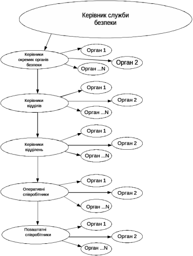 Структури мають ієрархічний, ступеневий характер. Ступені (рівні) - це сукупності організаційних ланок, розташованих на певних ієрархічних позиціях структур систем управління. Так, перший рівень - керівники окремих органів безпеки, другий - керівники відділів, третій - керівники відділень, четвертий - оперативні співробітники, п'ятий - позаштатні співробітники.